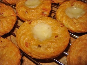 I’m making it my mission to try out some new appetizer recipes in the hopes of finding some good ones to take to various events this busy summer season. This recipe is a basic pate a choux, flavoured with black forest ham, swiss, and black pepper added in. It was tested on my significant other, who is my worst tester since I’m quite sure he’ll tell me he likes everything, along with my parents and my brother in law. Even my dad, who is generally picky about food said they were “interesting”. I always take that as a sign of approval.