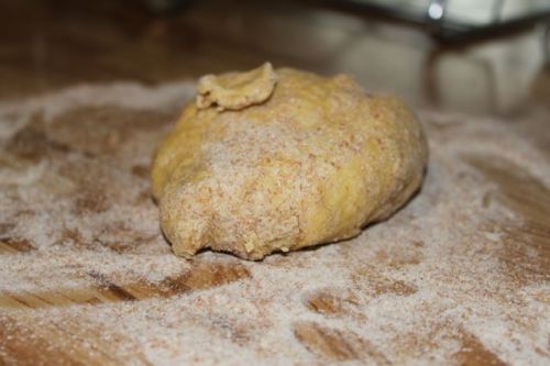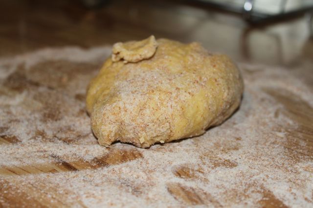 The ingredients will come together into a ball. You will now start to incorporate the whole wheat flour. You can also use more white flour here if you’d rather. Place the ball on a floured surface.