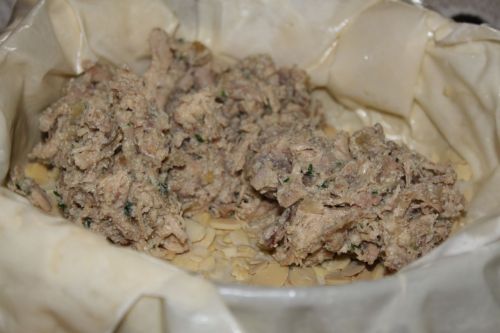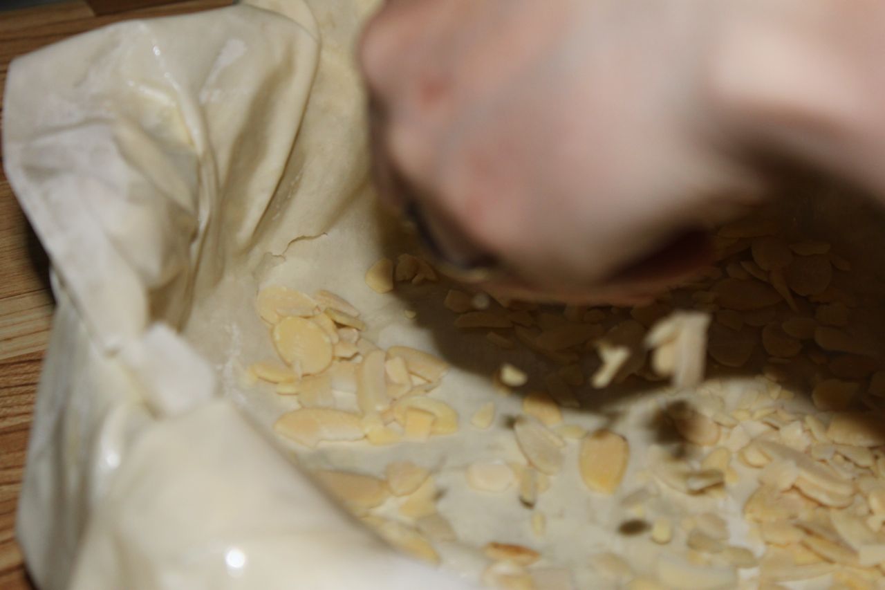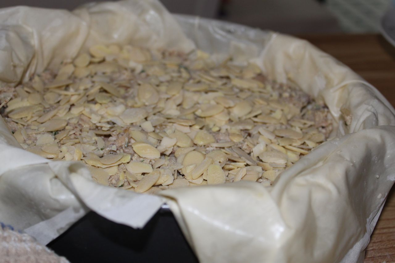 Sprinkle toasted sliced almonds in the bottom of the pastilla.
