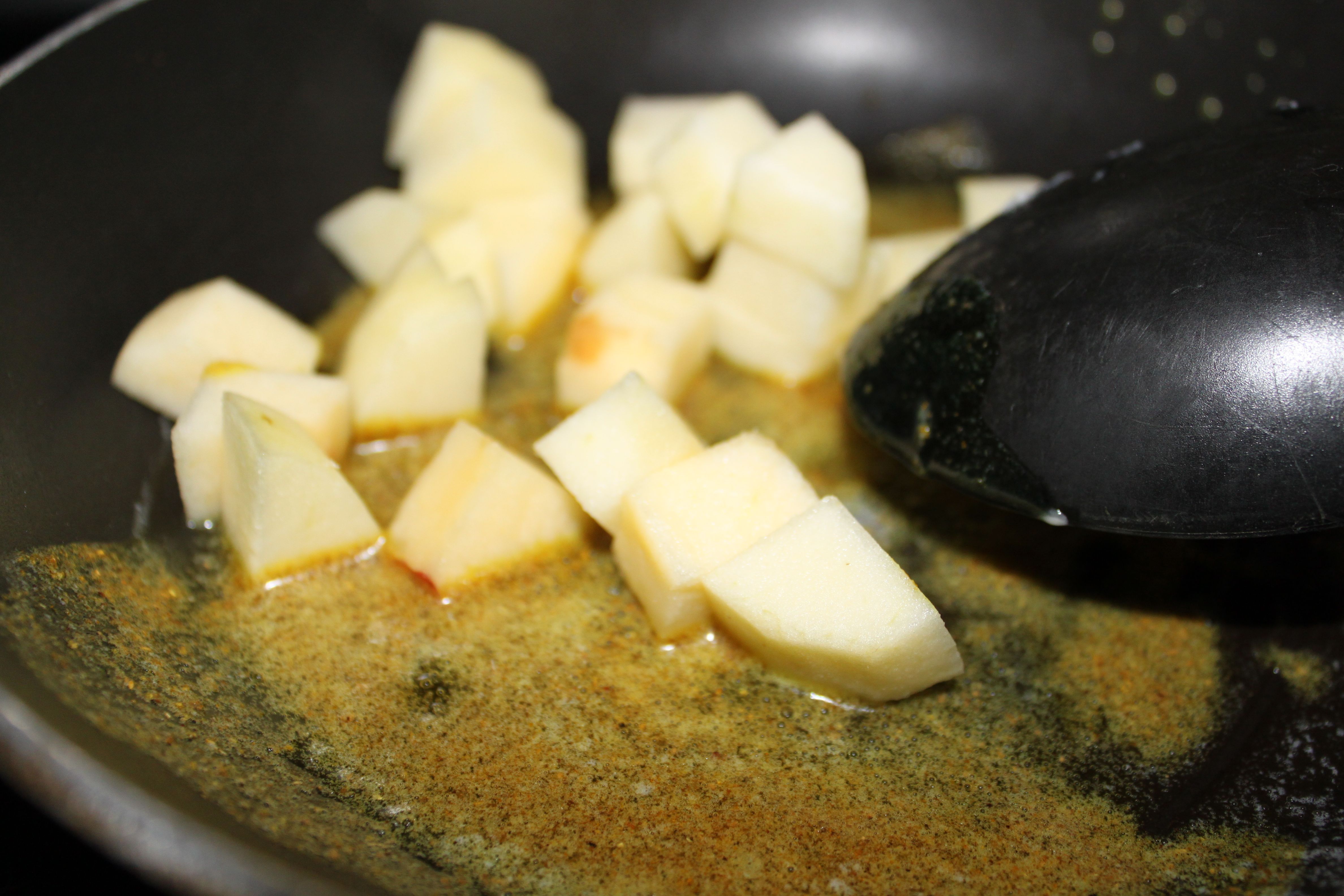 Dorie often suggests great ways to embellish or twist her recipes just a little bit, for a change or to better suit your tastes. This recipe included a suggested accompaniment of curried apples. I couldn’t resist.
