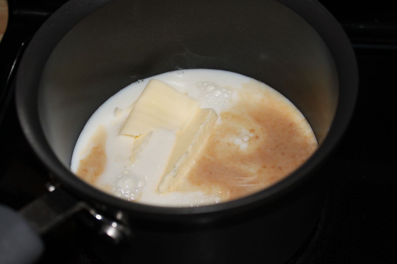 Now, warm the wet ingredients, so as to easily incorporate them into the dry while not being too hot to kill the yeast: