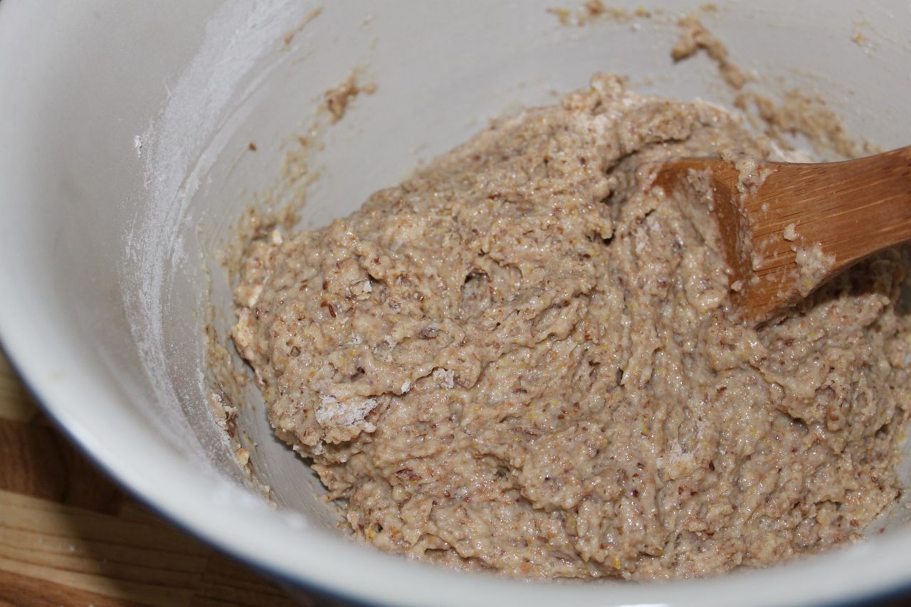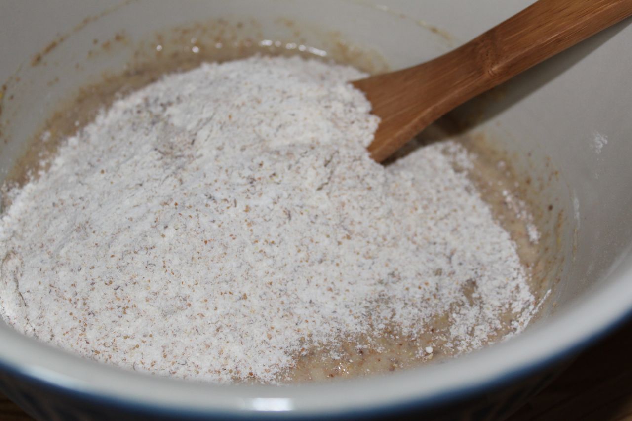 Start combining the ingredients by mixing some of the dry in with the wet, also adding an egg: