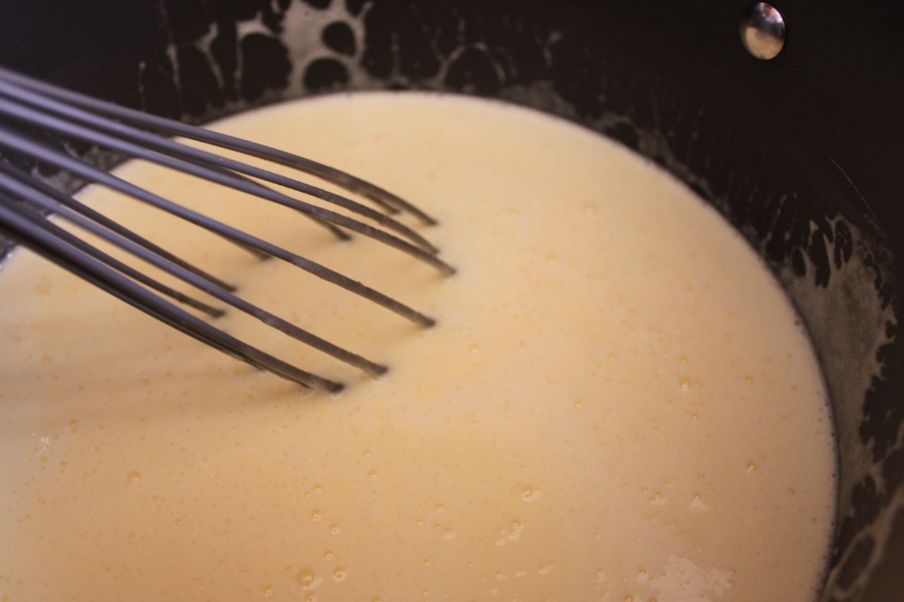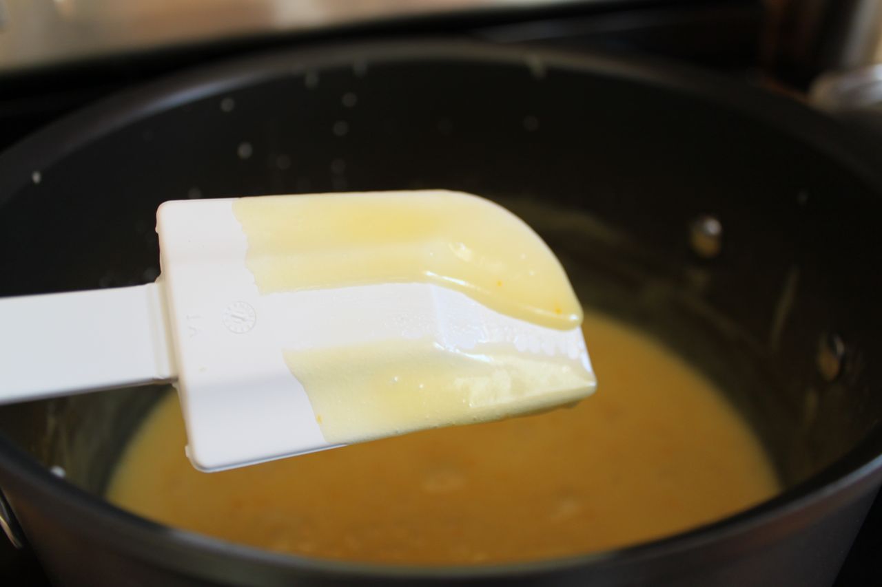 Transfer the mixture to a pot. Heat and whisk the mixture continually over medium-low heat (closer to low to discourage curdling and burning the curd).