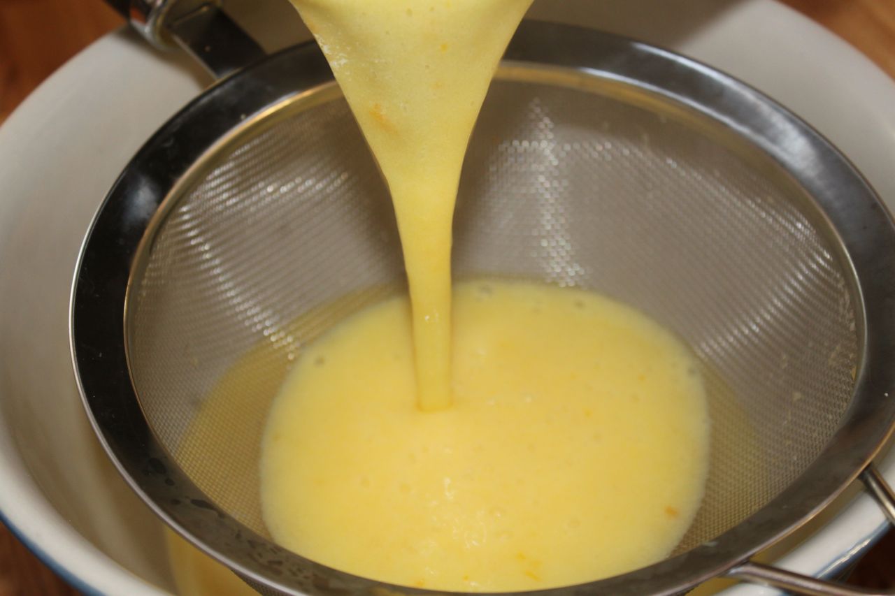 Strain the curd through a seive, which will catch the zest and any other small lumps that might have developed during the cooking process.