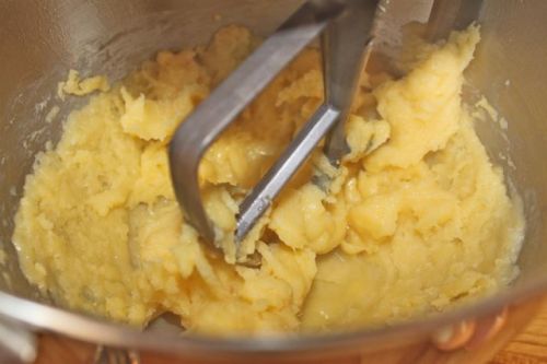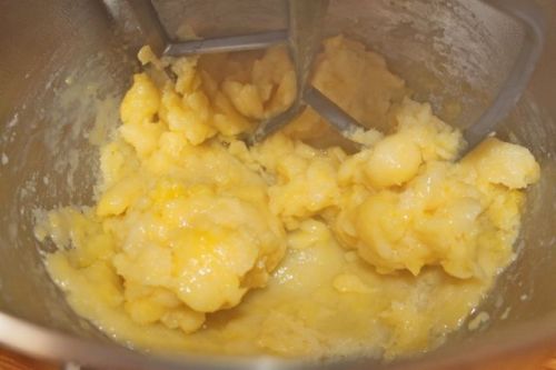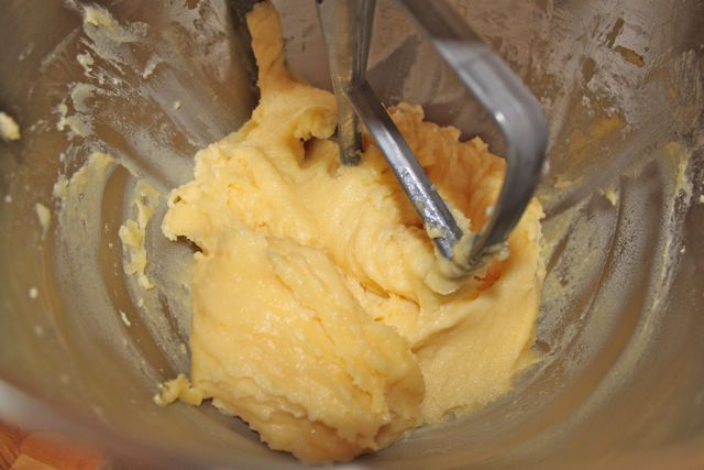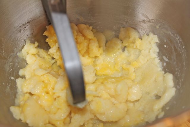 Turn the dough into the bowl of a stand mixer or a bowl you can use with a hand mixer (or a wooden spoon and more elbow grease). Let the dough sit for just a minute. Then add the eggs one at a time, beating all the while, until the dough is thick and shiny. Make sure each egg is fully incorporated before adding the next.