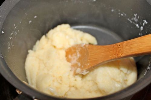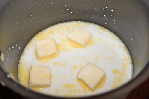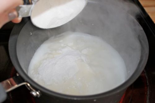 Bring the milk, water, butter, sugar (if you’re using it), and salt to a rapid boil in a saucepan over high heat.