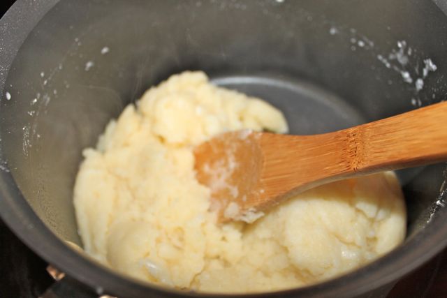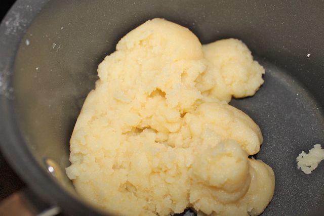The dough will come together, and a light crust will form on the bottom of the pan. Keep stirring for another minute or two to dry the dough. The dough will be very smooth.