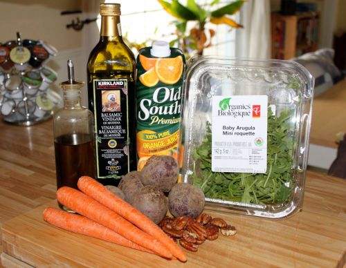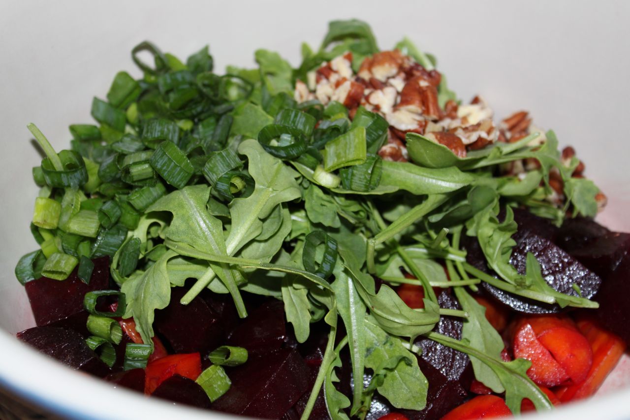 Any of the ingredients in this salad, other than the beets, can be easily substituted. Omit the carrots entirely if you don’t have any. Use whatever baby green you’d like to, or omit them entirely. If you don’t have pecans, walnuts or almonds will work just fine, or you can omit them entirely. Don’t have green onions? Try chives, or thinly sliced red onions. You get the idea.