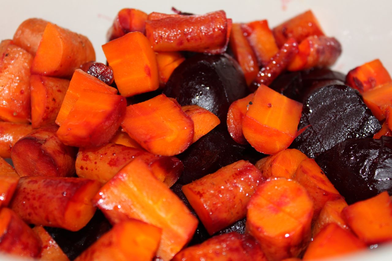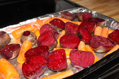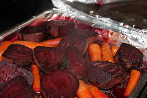 Start by roasting the beets and carrots. Preheat the oven to 350F. Line a baking sheet with foil and drizzle with olive oil. If using large-ish beets, cut them in half before putting them on the pan, along with the carrots. Cover the whole pan with foil. Throw them in the oven for at least an hour.