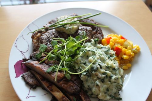Tonight’s dinner: grilled rib eye, mashed potatoes with garlic cream cheese and steamed spinach, Chickadee Larder corn relish, grilled portobello mushroom, and fresh pea shoots.