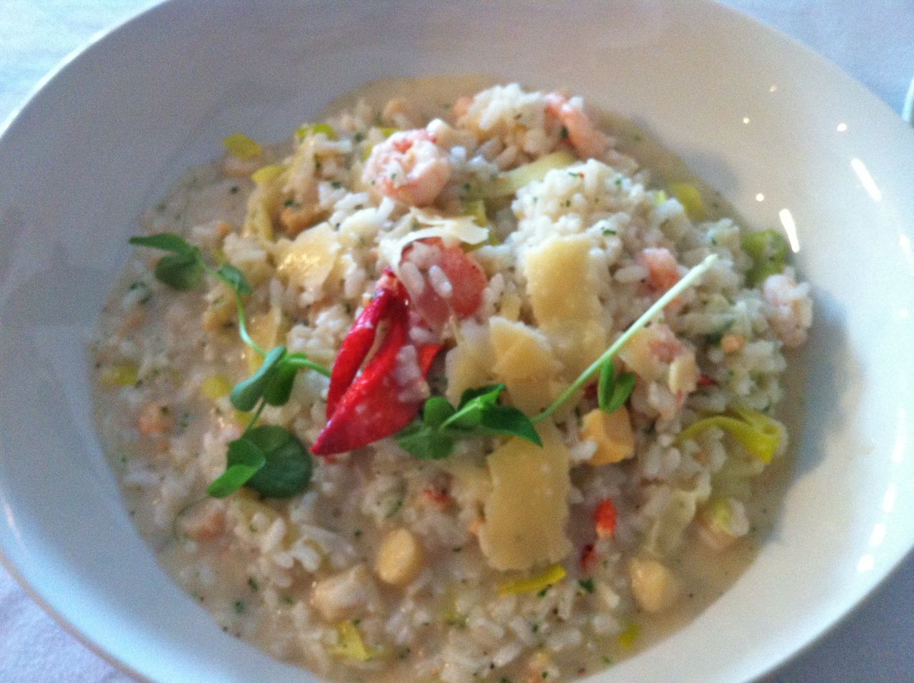 The “risotto” was filled with chunks of lobster, shrimp, and scallops. It was creamy and steaming hot when it arrived. I am calling it “risotto” because it wasn’t a risotto in the true sense, in that it wasn’t made with arborio rice. Regardless, it was creamy, hot, and slightly sweet. It was full of fresh herbs. I didn’t even season it at the table. As a matter of fact, there are no salt nor pepper on the tables – they are offered to you if you’d like them, and you grind them yourself.