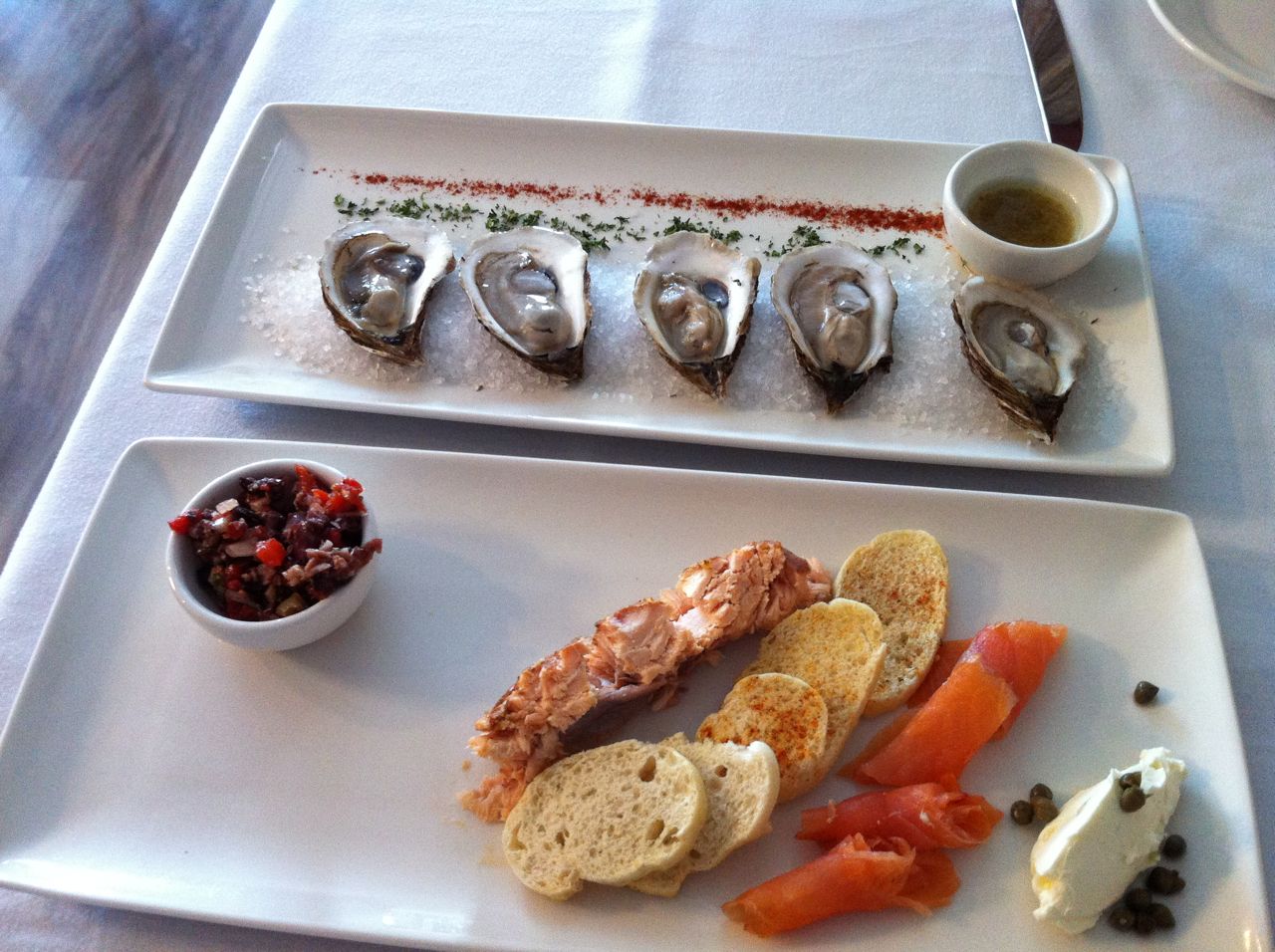 Once we had really looked over the menu, which had detailed descriptions for each dish (I LOVE this), we thought we’d each try an appetizer, and an entree. We opted for the salmon 2 ways and local oysters on the half shell as our appetizers, and seafood risotto, and prosciutto wrapped halibut as our entrees.