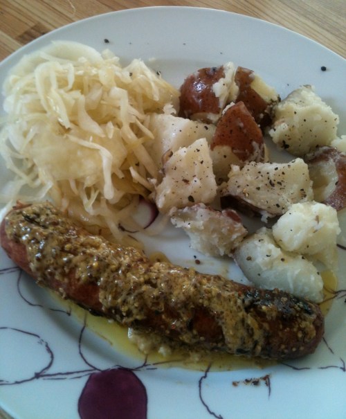 For dinner last night, we indulged in smoked sausages and saurkraut, both produced at local farms, along with boiled red potatoes, and mustard butter. The mustard butter is a Disney recipe – I picked up a cookbook there during our recent visit (we loved the Disney food!). After trying it, I can’t wait to put it on all kinds of things – potatoes, corn on the cob – the possibilities are endless. My apologies for the less than stunning picture – I realized a little too late that I’d have to blog about this great meal.