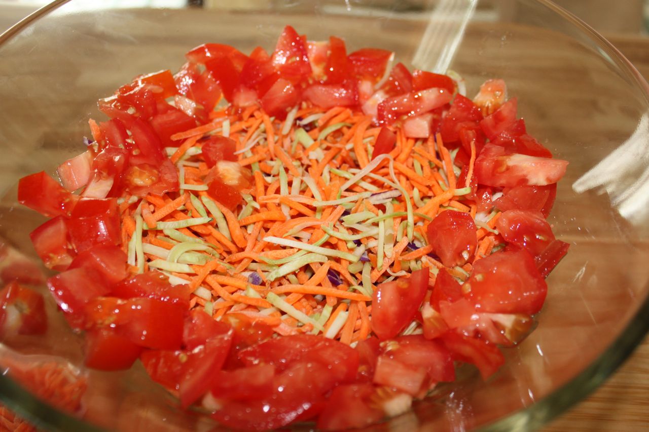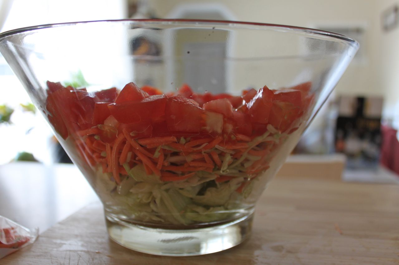 Layer the vegetables – lettuce and carrots first, then tomatoes. I layer all of the vegetables to the outside of the bowl first. That way if I need filler, I fill the middle with extras, like more lettuce.