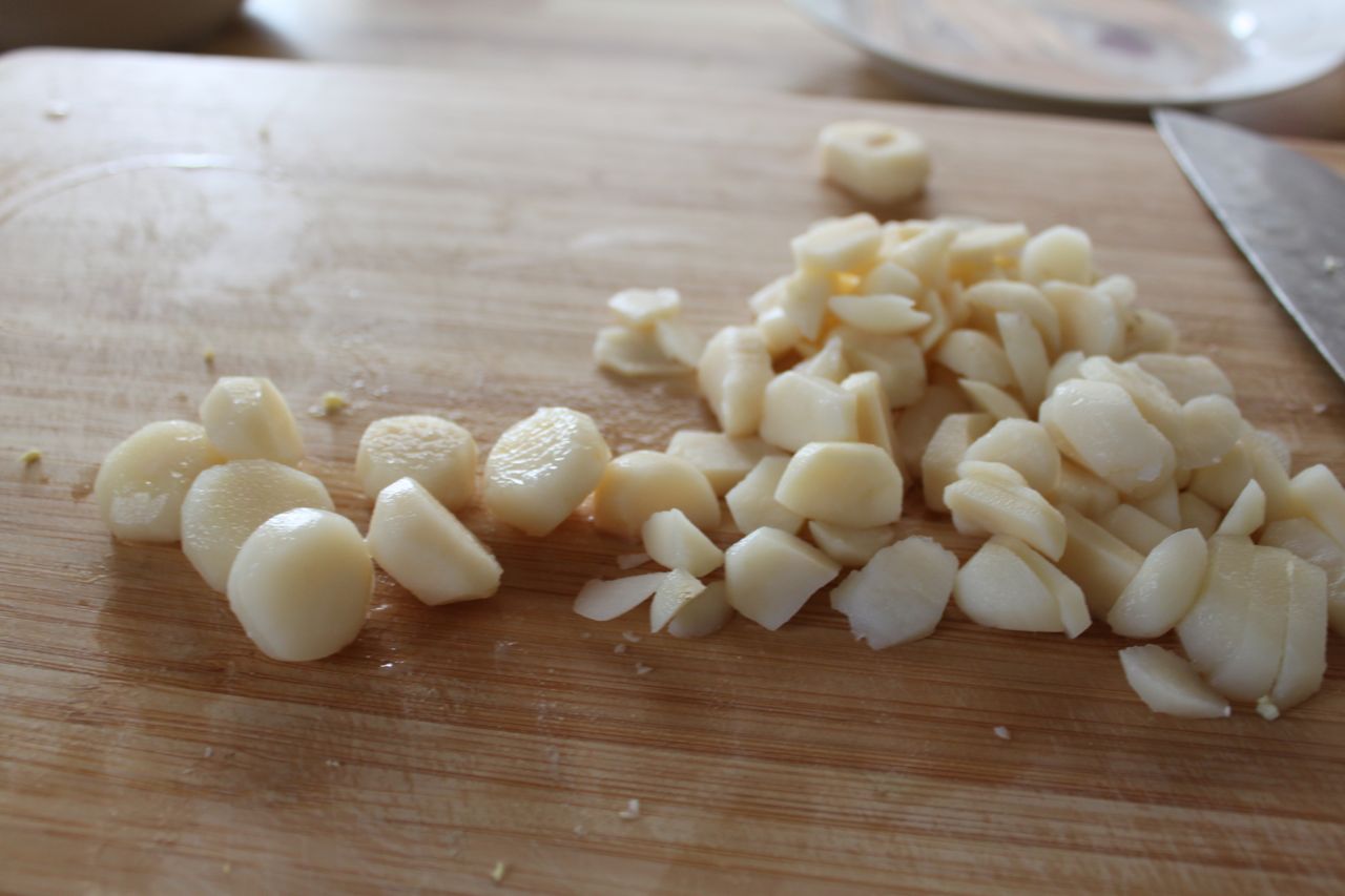 Prepare the rest of the ingredients needed for the salad: chop the water chestnuts, shred the cheese, make sure the peas are thawed, slice the boiled eggs.