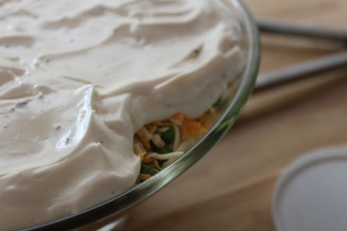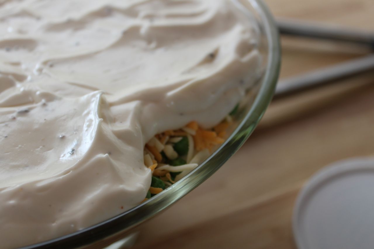 Now it’s time for the dressing. Spread an even layer of dressing all over the salad, reaching the edges of the bowl. By reaching the edges of the bowl, you seal the freshness of the layers underneath. I actually recommend letting this salad sit for up to a day before you serve it. But make sure you seal those edges!